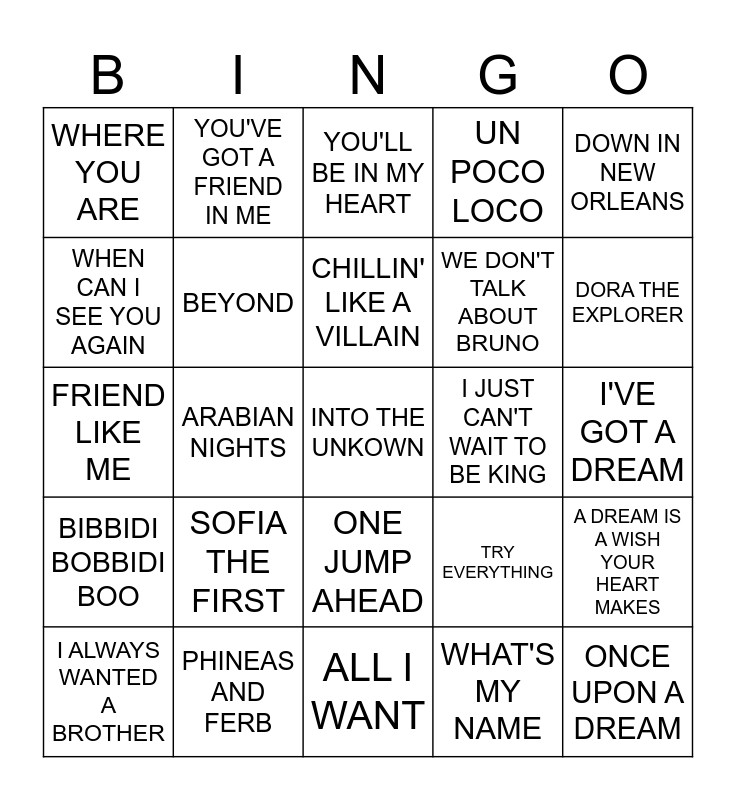 This bingo card has 55 words: DO YOU WANT TO BUILD A SNOWMAN, I ALWAYS WANTED A BROTHER, YOU'RE WELCOME, WHERE YOU ARE, ALL I WANT, HAWAIIAN ROLLER COASTER RIDE, BEYOND, WHEN WILL MY LIFE BEGIN, WE DON'T TALK ABOUT BRUNO, LET IT GO, UN POCO LOCO, FAMILY MADRIGAL, I'LL MAKE A MAN OUT OF YOU, UNDER THE SEA, HAKUNA MATATA, A WHOLE NEW WORLD, DOWN IN NEW ORLEANS, ARABIAN NIGHTS, LOVE IS AN OPEN DOOR, INTO THE UNKOWN, I JUST CAN'T WAIT TO BE KING, PART OF YOUR WORLD, TRY EVERYTHING, YOU'LL BE IN MY HEART, ROTTEN TO THE CORE, CHILLIN' LIKE A VILLAIN, WHAT'S MY NAME, ZERO TO HERO, I'VE GOT A DREAM, A DREAM IS A WISH YOUR HEART MAKES, DIG A LITTLE DEEPER, IN SUMMER, A GIRL WORTH FIGHTING FOR, WE'RE ALL IN THIS TOGETHER, WHEN CAN I SEE YOU AGAIN, FRIEND LIKE ME, THE GOSPEL TRUTH, BIBBIDI BOBBIDI BOO, ONCE UPON A DREAM, IMMORTALS, YOU'VE GOT A FRIEND IN ME, LIFE IS A HIGHWAY, COLORS OF THE WIND, WE OWN THE NIGHT, SOFIA THE FIRST, PHINEAS AND FERB, JESSIE, PERRY THE PLATYPUS, DOC MCSTUFFINS, DORA THE EXPLORER, HOW FAR I'LL GO, MOTHER KNOWS BEST, POOR UNFORTUNATE SOULS, ONE JUMP AHEAD and BE OUR GUEST.