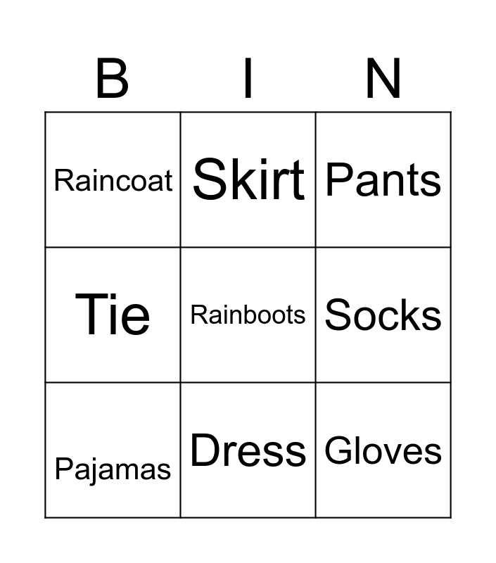 This bingo card has 18 words: Shoes, Boots, Pants, Raincoat, Hat, Tie, T-shirt, Skirt, Dress, Gloves, Tie, Rainboots, Jacket, Socks, Pajamas, Shirt, Jumper and Vest.