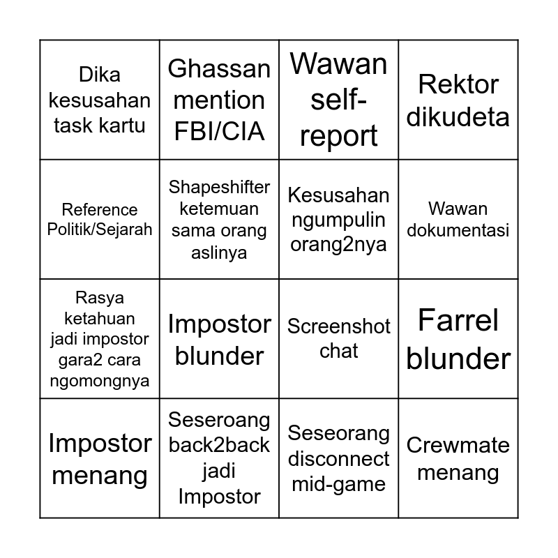 This bingo card has 16 words: Seseroang back2back jadi Impostor, Farrel blunder, Wawan self-report, Dika kesusahan task kartu, Rasya ketahuan jadi impostor gara2 cara ngomongnya, Ghassan mention FBI/CIA, Screenshot chat, Seseorang disconnect mid-game, Reference Politik/Sejarah, Shapeshifter ketemuan sama orang aslinya, Impostor menang, Rektor dikudeta, Impostor blunder, Wawan dokumentasi, Kesusahan ngumpulin orang2nya and Crewmate menang.