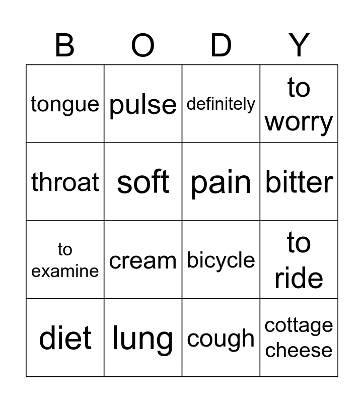 This bingo card has 16 words: lung, to ride, definitely, tongue, to examine, pulse, bicycle, cough, throat, soft, diet, to worry, cream, bitter, pain and cottage cheese.