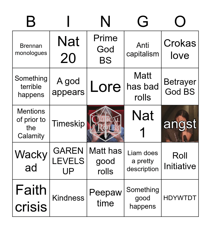 This bingo card has 1 images, a free space and 24 words: GAREN LEVELS UP, Kindness, Lore, Faith crisis, Crokas love, Brennan monologues, Something terrible happens, Nat 20, Nat 1, Matt has good rolls, Matt has bad rolls, Mentions of prior to the Calamity, Liam does a pretty description, Roll Initiative, A god appears, Something good happens, angst, Prime God BS, Betrayer God BS, Timeskip, HDYWTDT, Wacky ad, Anti capitalism and Peepaw time.