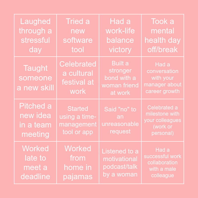 This bingo card has 16 words: Worked from home in pajamas, Celebrated a milestone with your colleagues (work or personal), Had a work-life balance victory, Laughed through a stressful day, Pitched a new idea in a team meeting, Tried a new software tool, Said "no" to an unreasonable request, Listened to a motivational podcast/talk by a woman, Taught someone a new skill, Celebrated a cultural festival at work, Worked late to meet a deadline, Took a mental health day off/break, Started using a time-management tool or app, Had a conversation with your manager about career growth, Built a stronger bond with a woman friend at work and Had a successful work collaboration with a male colleague.
