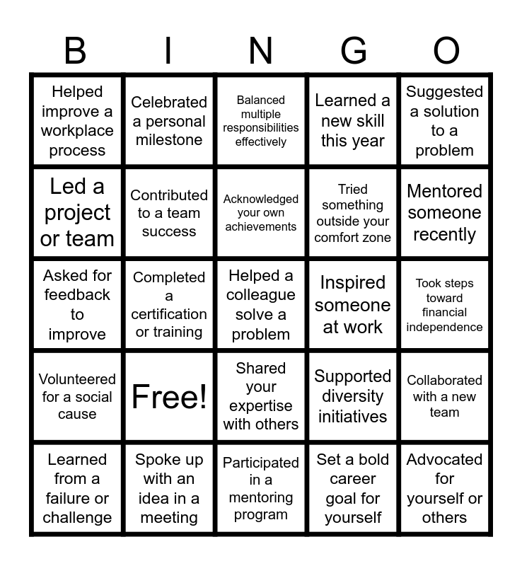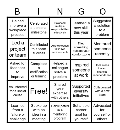 This bingo card has 25 words: Free!, Participated in a mentoring program, Acknowledged your own achievements, Learned from a failure or challenge, Suggested a solution to a problem, Helped improve a workplace process, Led a project or team, Celebrated a personal milestone, Inspired someone at work, Shared your expertise with others, Tried something outside your comfort zone, Asked for feedback to improve, Supported diversity initiatives, Collaborated with a new team, Contributed to a team success, Advocated for yourself or others, Took steps toward financial independence, Balanced multiple responsibilities effectively, Mentored someone recently, Completed a certification or training, Helped a colleague solve a problem, Spoke up with an idea in a meeting, Volunteered for a social cause, Learned a new skill this year and Set a bold career goal for yourself.