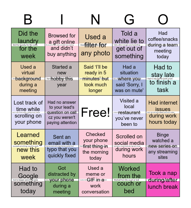This bingo card has 27 images, a free space and 28 words: Binge watched a new series on any streaming sites, Received a thank-you email for something small you did, Had a situation where you said ‘Sorry, I was on mute', Worked from the couch or bed, Used a virtual background during a meeting, Used a filter for any photo, Browsed for a gift online and didn’t buy anything, Learned something new this week, Visited a local restaurant you’ve never been to, Had to Google something today, Lost track of time while scrolling on your phone, Told a white lie to get out of something, Got distracted by your phone during a meeting, Used a meme or GIF in a work conversation, Had to stay late to finish a task, Recently browsed through your camera roll and found old pictures, Sent an email with a typo that you quickly fixed, Started a new hobby this year, Said ‘I’ll be ready in 5 minutes’ but took much longer, Checked your phone first thing in the morning today, Did the laundry for the week, Listens to music while working, Took a nap during/after lunch break, Had no answer to your lead's question on call cz you weren't paying attention, Had internet issues during work hours today, Scrolled on social media during work hours, Had coffee/snacks during a team meeting today and Skipped a meeting this week on purpose.