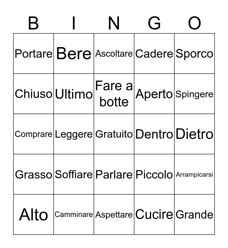 This bingo card has a free space and 99 words: Sorridere, Piangere, Pensare, Ascoltare, Ridere, Acchiappare, Lanciare, Rompere, Dipingere, Scrivere, Spaccare, Tagliare, Mangiare, Parlare, Scavare, Portare, Bere, Fare, Saltare, Camminare a carponi, Ballare, Lavarsi, Lavorare a maglia, Giocare, Guardare, Arrampicarsi, Fare a botte, Dormire, Prendere, Saltare la corda, Aspettare, Cucire, Cucinare, Nascondersi, Leggere, Comprare, Cantare, Spazzare, Raccogliere, Soffiare, Tirare, Spingere, Cadere, Camminare, Correre, Stare seduti, Colorare, Cancellare, Incollare, Disegnare, Aprire, Grande, Piccolo, Vecchia, Nuova, Buono, Cattivo, Freddo, Caldo, Lontano, Vicino, Bagnato, Asciutto, In cima, In fondo, Sporco, Pulito, Sopra, Sotto, Grasso, Magro, Aperto, Chiuso, Pochi, Molti, Primo, Ultimo, Sinistra, Destra, Fuori, Dentro, Facile, Difficile, Vuoto, Pieno, Morbido, Duro, Davanti, Dietro, Alto, Basso, Lungo, Corto, Vivo, Morto, Scuro, Chiaro, Giu and Su.