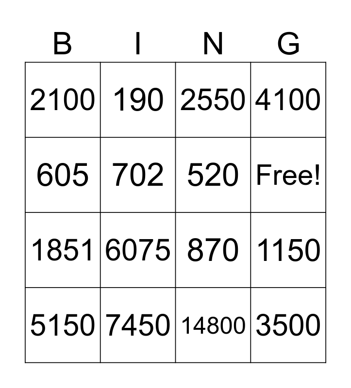 This bingo card has 17 words: 14800, 5150, 2550, 2100, 6075, 4100, 1150, 520, Free!, 702, 7450, 870, 605, 190, 1851, 1150 and 3500.