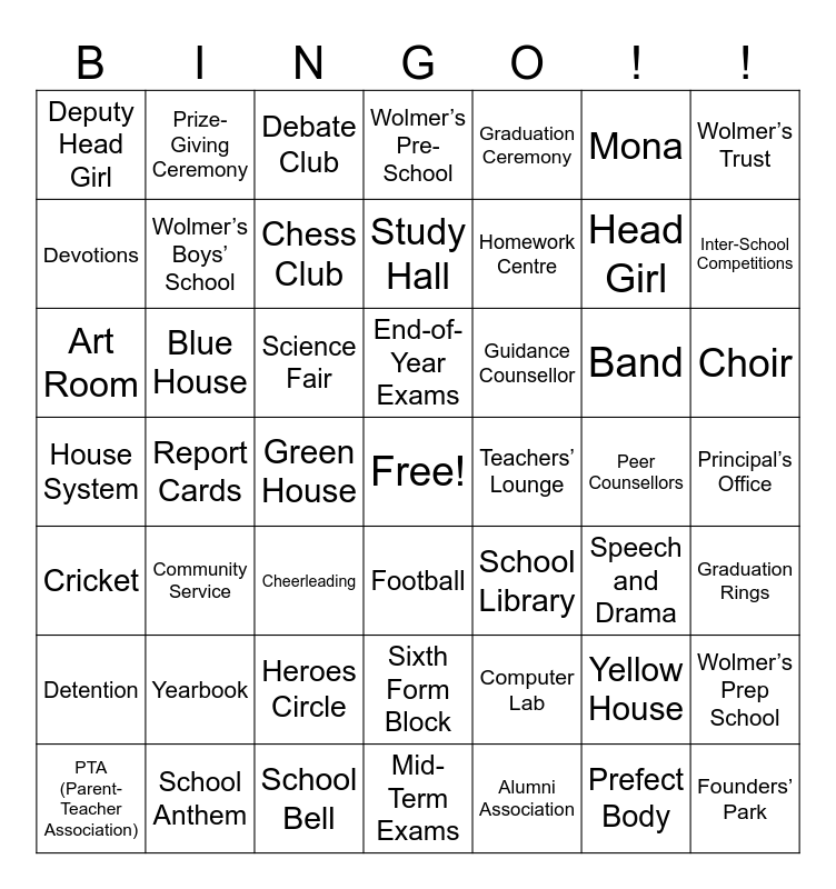 This bingo card has a free space and 61 words: School Crest, House System, Red House, Blue House, Green House, Yellow House, Wolmer’s Trust, Wolmer’s Girls’ School, Wolmer’s Boys’ School, Wolmer’s Prep School, Wolmer’s Pre-School, Heroes Circle, Mona, Cheerleading, Prefect Body, Deputy Head Girl, Head Girl, Graduation Ceremony, Chapel Service, Devotions, Inter-School Competitions, Debate Club, Choir, Band, Track and Field, Football, Cricket, Tennis, Chess Club, Speech and Drama, School Magazine, Yearbook, Alumni Association, Founder's Day, Prize-Giving Ceremony, Teachers’ Lounge, Sixth Form Block, Homework Centre, School Library, Study Hall, Computer Lab, Science Fair, Art Room, Home Economics Lab, Guidance Counsellor, Principal’s Office, PTA (Parent-Teacher Association), School Bell, Mid-Term Exams, End-of-Year Exams, Report Cards, Uniform Inspection, Detention, Peer Counsellors, Outreach Programmes, Community Service, Graduation Rings, School Anthem, JCDC Competitions, Founders’ Park and Historic Archway.