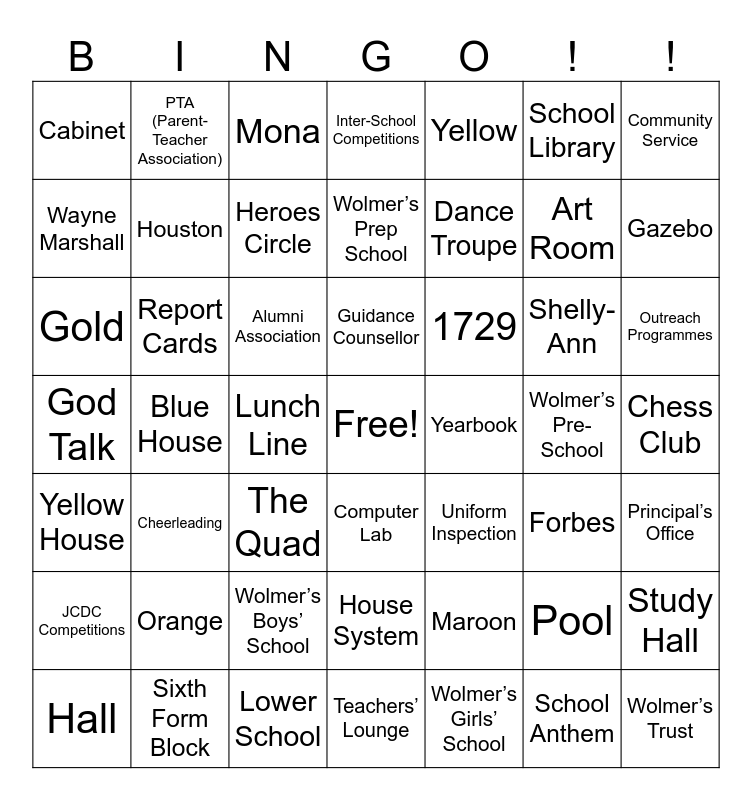 This bingo card has a free space and 100 words: 295, Maroon, Gold, John, Passion and Purity, Cowper, Netball, Volleyball, Holy Lawn, Sports Day, Upper School, Staffroom, Lower School, God Talk, Barrows, Forbes, Houston, Hollar, Murray, Spirit Week, Office, Honours Class, Pool, Science Lab, Orange, Gazebo, Yellow, 1729, Age Quod Agis, Canteen, Dance Troupe, Cabinet, Auditorium, Hall, Lunch Line, Wayne Marshall, Shelly-Ann, Tiffa, The Quad, Wolmer’s Trust, Wolmer’s Girls’ School, Wolmer’s Boys’ School, Wolmer’s Prep School, Wolmer’s Pre-School, Heroes Circle, Mona, School Crest, House System, Red House, Blue House, Green House, Yellow House, Cheerleading, Prefect Body, Deputy Head Girl, Head Girl, Graduation Ceremony, Chapel Service, Devotions, Inter-School Competitions, Debate Club, Choir, Band, Track and Field, Football, Cricket, Tennis, Chess Club, Speech and Drama, School Magazine, Yearbook, Alumni Association, Founder's Day, Prize-Giving Ceremony, Teachers’ Lounge, Sixth Form Block, Homework Centre, School Library, Study Hall, Computer Lab, Science Fair, Art Room, Home Economics Lab, Guidance Counsellor, Principal’s Office, PTA (Parent-Teacher Association), School Bell, Mid-Term Exams, End-of-Year Exams, Report Cards, Uniform Inspection, Detention, Peer Counsellors, Outreach Programmes, Community Service, Graduation Rings, School Anthem, JCDC Competitions, Founders’ Park and Historic Archway.