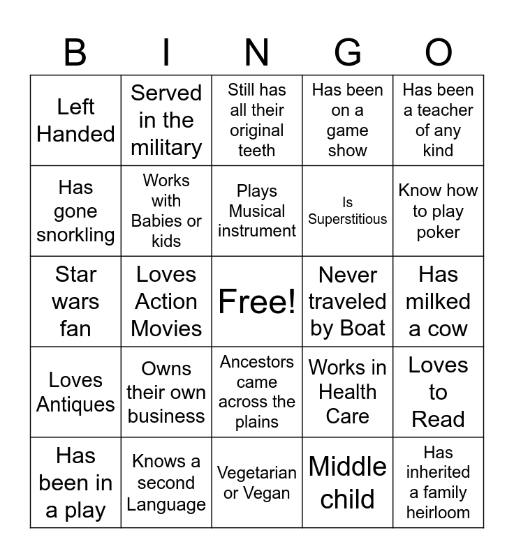 This bingo card has a free space and 74 words: Favorite music is Country, Doesn't have a Facebook page, Still has all their original teeth, Knows card/magic tricks, Has been on TV, Knows a song in a language you don't speak, Has food Allergy, Has done a painting, Has been in a play, Read scripture today, Has more than one kind of pet, Can Hula Hoop, Plays Musical instrument, Has gone snorkling, Family member serving a mission, Loves Action Movies, Has an Apple Phone, Know how to play poker, Driven a motor cycle, Star wars fan, Works with Babies or kids, Served in the military, Has been on a game show, Knows origin of Maiden name, Has inherited a family heirloom, Has played D&D, Plays Video Games, Has a collection, Knows their Hogwarts House, Has never left Australia, Has been a teacher of any kind, Writes in a Journal, Loves to Garden, Youngest in Family, Oldest in Family, Middle child, Likes Sushi, Enjoys Camping, Loves Roller coasters, Never broke a bone, Vegetarian or Vegan, Knows a second Language, Practises Yoga or Meditation, Can Sew, Knit or Crochet, Shares name with ancestor, Left Handed, Does/Did competitive sports, Owns their own business, Made your bed today, Exercises Regularly, Doesn't like oregano, Has been to PAX/ ComiCon, Has milked a cow, Visited more than 5 temples, Enjoys Family History, Can recite a poem from memory, Ancestors came across the plains, Been to Costco, Seen the Statue of Liberty, Loves to Read, Is Superstitious, Has run a marathon, Loves Antiques, Likes a boy band, Never traveled by Boat, Seen the same movie more than 10 times, Volunteers for a local charity or organization, Has been on Blind Date, Works in Health Care, Watches Reality TV, Has met a celebrity in person, Can bake from Scratch, Never had stitches and Has Instagram.