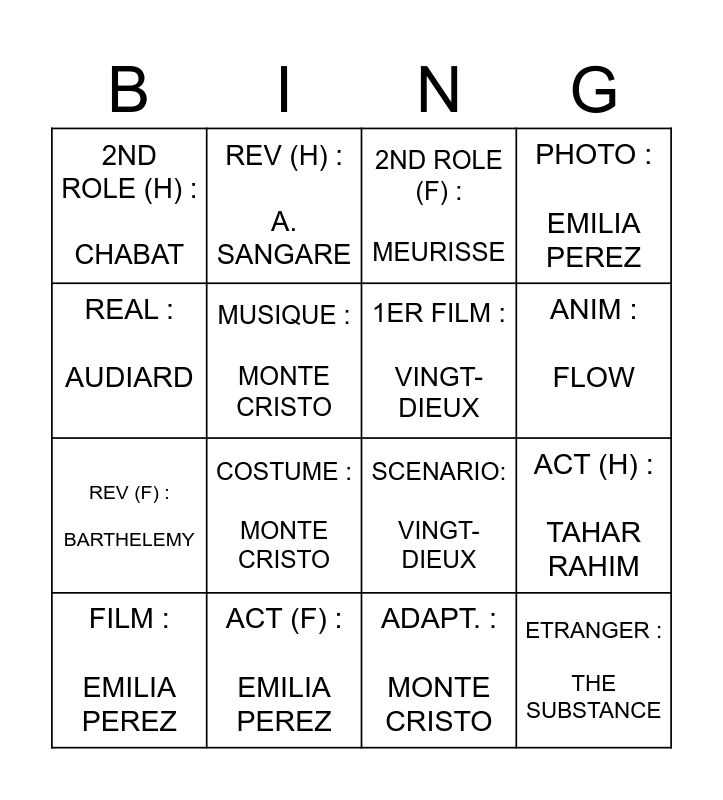 This bingo card has 16 words: ACT (F) : EMILIA PEREZ, ACT (H) : TAHAR RAHIM, 2ND ROLE (F) : MEURISSE, 2ND ROLE (H) : CHABAT, REV (F) : BARTHELEMY, REV (H) : A. SANGARE, SCENARIO: VINGT-DIEUX, ADAPT. : MONTE CRISTO, REAL : AUDIARD, MUSIQUE : MONTE CRISTO, FILM : EMILIA PEREZ, PHOTO : EMILIA PEREZ, COSTUME : MONTE CRISTO, ANIM : FLOW, 1ER FILM : VINGT-DIEUX and ETRANGER : THE SUBSTANCE.