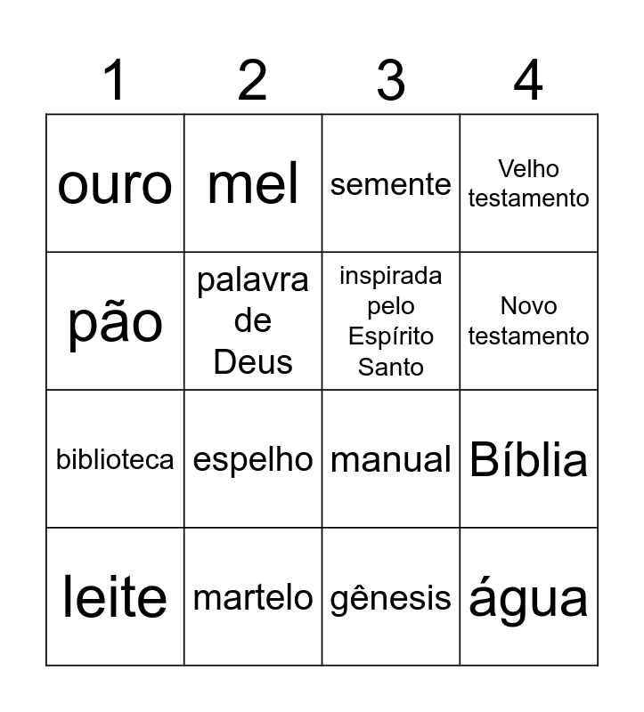 This bingo card has 20 words: Bíblia, escudo, semente, fogo, leite, pão, martelo, ouro, biblioteca, mel, espelho, manual, palavra de Deus, água, inspirada pelo Espírito Santo, tesouro, Novo testamento, Velho testamento, gênesis and apocalipse.