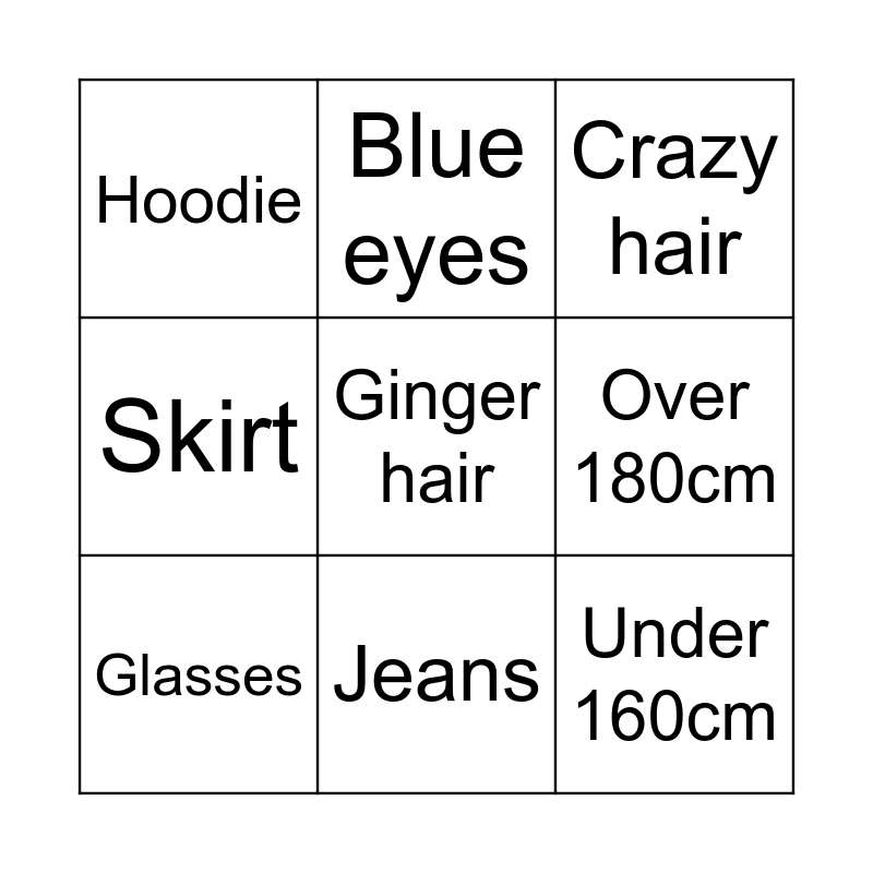 This bingo card has 9 words: Glasses, Crazy hair, Blue eyes, Skirt, Hoodie, Over 180cm, Ginger hair, Under 160cm and Jeans.
