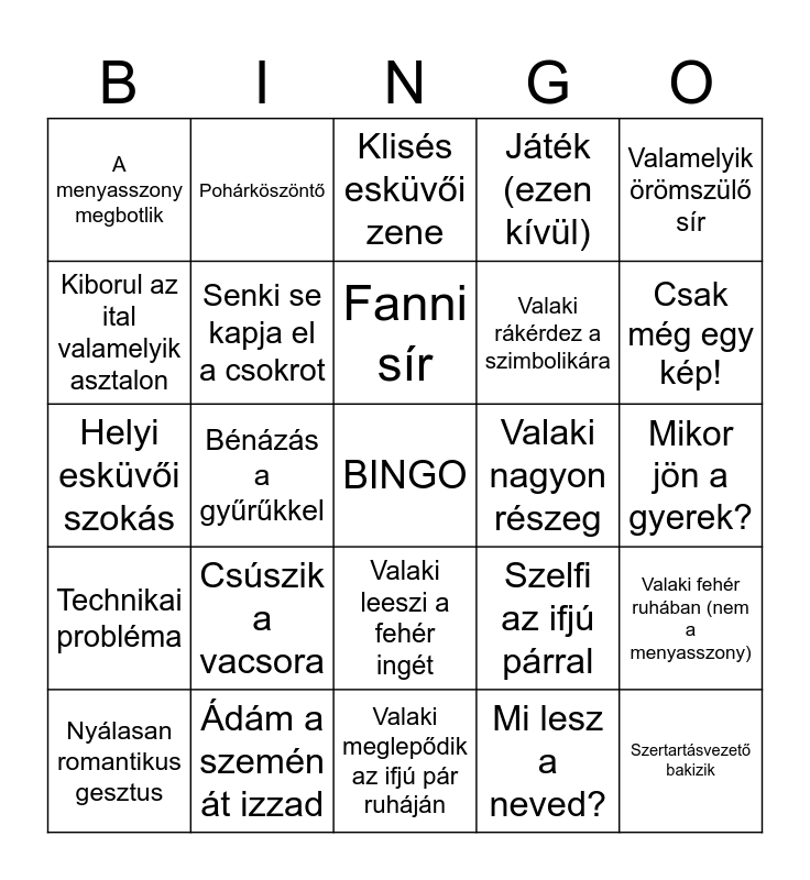 This bingo card has a free space and 26 words: Valaki leeszi a fehér ingét, Mi lesz a neved?, Fanni sír, Ádám a szemén át izzad, Valamelyik örömszülő sír, A menyasszony megbotlik, Kiborul az ital valamelyik asztalon, Pohárköszöntő, Mikor jön a gyerek?, Szelfi az ifjú párral, Valaki rákérdez a szimbolikára, Helyi esküvői szokás, Valaki fehér ruhában (nem a menyasszony), Nyálasan romantikus gesztus, Bénázás a gyűrűkkel, Valaki nem örül a tombola nyereményének, Játék (ezen kívül), Technikai probléma, Klisés esküvői zene, Szertartásvezető bakizik, Csak még egy kép!, Valaki meglepődik az ifjú pár ruháján, Valaki nagyon részeg, Csúszik a vacsora, Senki se kapja el a csokrot and Vonatozás.