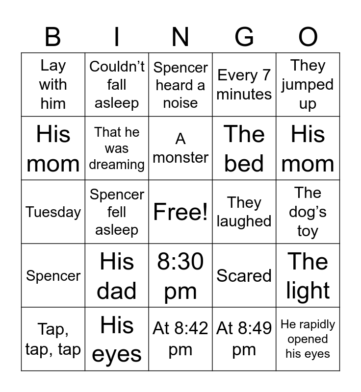 This bingo card has a free space and 24 words: His dad, His eyes, A monster, Tap, tap, tap, They jumped up, Lay with him, His mom, Couldn’t fall asleep, They laughed, 8:30 pm, The bed, Tuesday, Scared, The light, That he was dreaming, At 8:49 pm, The dog’s toy, Spencer heard a noise, His mom, Spencer fell asleep, He rapidly opened his eyes, Spencer, Every 7 minutes and At 8:42 pm.