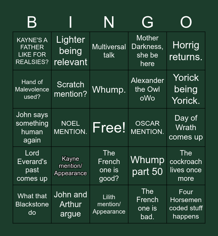 This bingo card has a free space and 24 words: Kayne mention/ Appearance, John and Arthur argue, Whump., What that Blackstone do, Horrig returns., KAYNE'S A FATHER LIKE FOR REALSIES?, Hand of Malevolence used?, Lighter being relevant, OSCAR MENTION., The French one is good?, Alexander the Owl oWo, John says something human again, Whump part 50, The cockroach lives once more, Scratch mention?, The French one is bad., Day of Wrath comes up, Multiversal talk, Yorick being Yorick., NOEL MENTION., Four Horsemen coded stuff happens, Lord Everard's past comes up, Mother Darkness, she be here and Lilith mention/ Appearance.