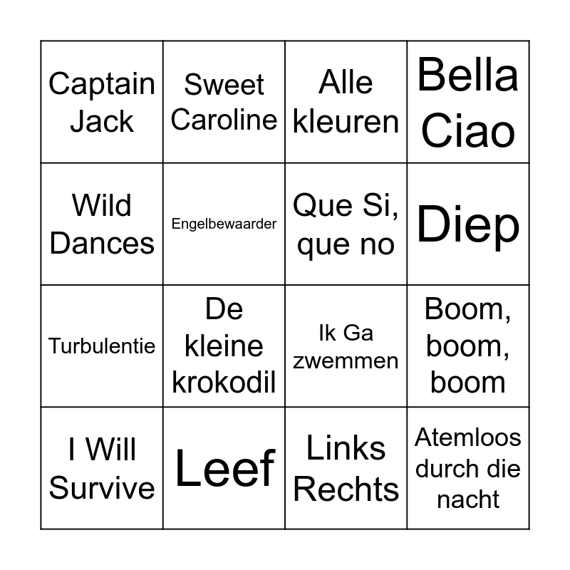 This bingo card has 26 words: Thruster Tigers!, Europapa, Diep, The Ketchup Song, Wild Dances, Captain Jack, Engelbewaarder, Sweet Caroline, Links Rechts, Walk on water, Turbulentie, Ik Ga zwemmen, YMCA, Dancing queen, Boom, boom, boom, Grease, Bella Ciao, Atemloos durch die nacht, Alle kleuren, I Will Survive, De kleine krokodil, Gagnam Style, Leef, Barbie Girl, Que Si, que no and Helikopter.