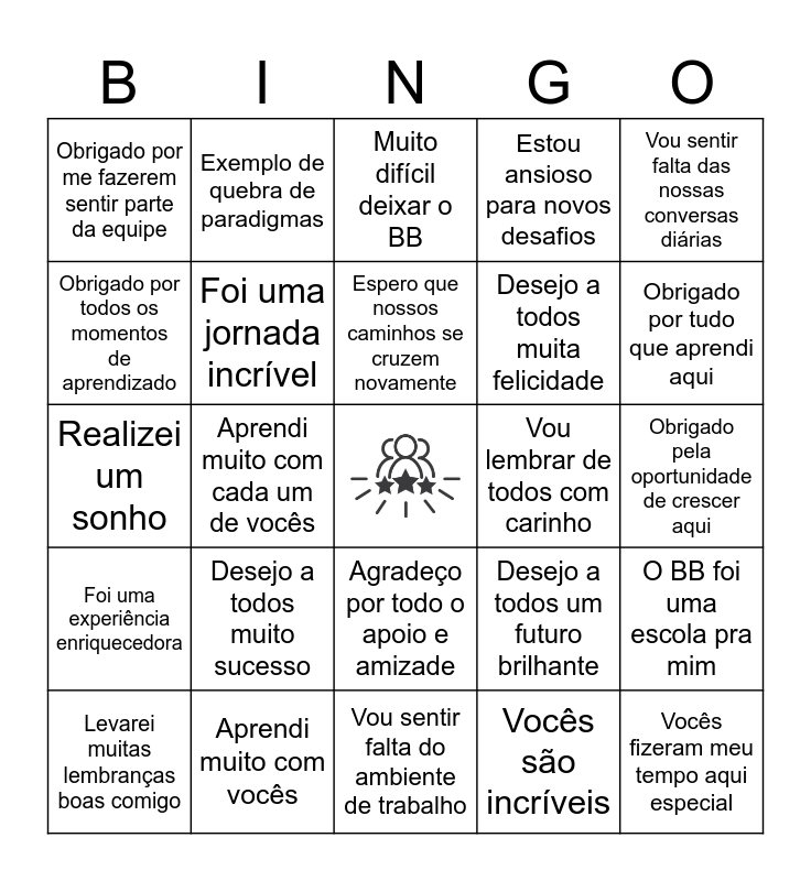 This bingo card has a free space and 39 words: Foi um prazer trabalhar com todos vocês, Obrigado por todos os momentos inesquecíveis, Desejo a todos muito sucesso no futuro, Foi uma jornada incrível, Levarei muitas lembranças boas comigo, Agradeço por todo o apoio e amizade, Espero que nossos caminhos se cruzem novamente, Obrigado por tudo, Vou sentir falta das nossas conversas diárias, Foi uma experiência enriquecedora, Aprendi muito com cada um de vocês, Estou ansioso para novos desafios, Vocês fizeram meu tempo aqui especial, Obrigado pela oportunidade de crescer aqui, Vou lembrar de todos com carinho, Desejo a todos muito sucesso, Encerramento deste ciclo, Obrigado por me fazerem sentir parte da equipe, Vou levar muitas lições daqui, Desejo a todos um futuro brilhante, Obrigado por todos os momentos de aprendizado, Vou sentir falta do ambiente de trabalho, Desejo a todos muita felicidade, Obrigado por tudo que aprendi aqui, Novo ciclo se inicia, Você tem alguma coisa pra falar?, Mais que colega, uma querida, Gratidão por te conhecer, Referência de história de vida, Exemplo de quebra de paradigmas, Uma gigante admirada, Vou sentir muita saudade de vocês, Muito difícil deixar o BB, Aprendi muito com vocês, Vocês são incríveis, Fiz muitos amigos aqui, O BB foi uma escola pra mim, Realizei um sonho and Nunca imaginei que conseguiria chegar aqui.