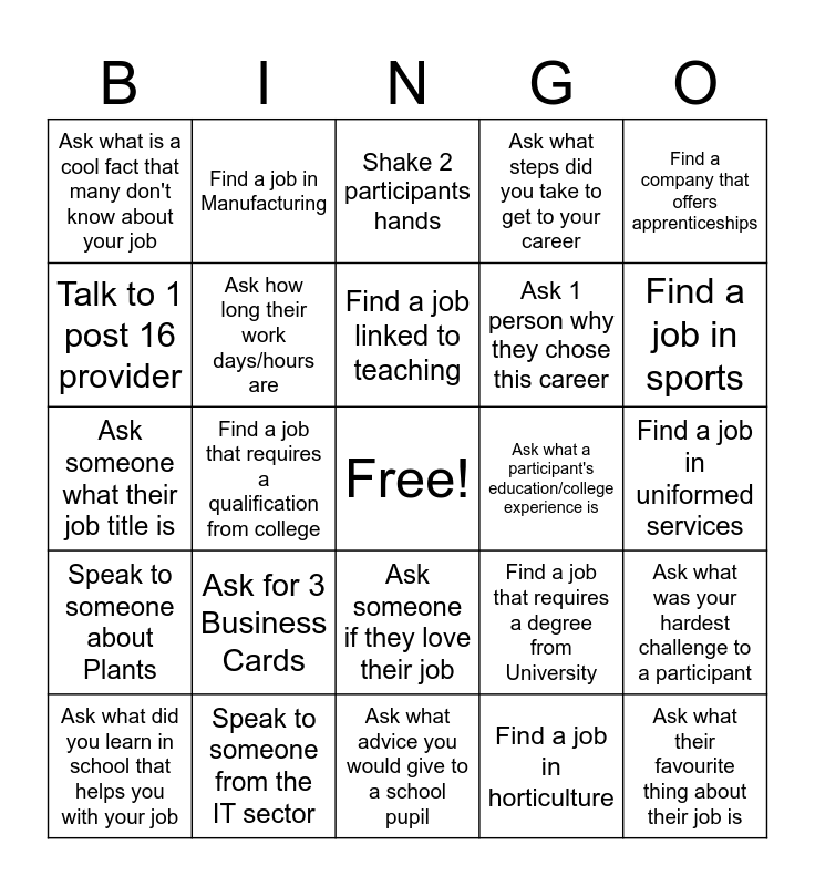 This bingo card has a free space and 24 words: Ask for 3 Business Cards, Speak to someone from the IT sector, Find a job linked to teaching, Ask what did you learn in school that helps you with your job, Find a company that offers apprenticeships, Ask what is a cool fact that many don't know about your job, Talk to 1 post 16 provider, Find a job in Manufacturing, Ask what a participant's education/college experience is, Ask someone if they love their job, Ask 1 person why they chose this career, Ask someone what their job title is, Find a job that requires a degree from University, Ask what was your hardest challenge to a participant, Ask how long their work days/hours are, Find a job in horticulture, Find a job in uniformed services, Shake 2 participants hands, Find a job in sports, Find a job that requires a qualification from college, Ask what their favourite thing about their job is, Speak to someone about Plants, Ask what steps did you take to get to your career and Ask what advice you would give to a school pupil.
