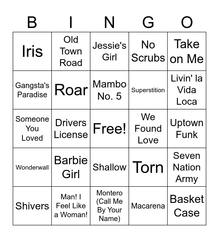 This bingo card has a free space and 104 words: Never Gonna Give You Up, Livin' on a Prayer, Take on Me, Sweet Child o' Mine, Like a Prayer, Eye of the Tiger, Africa, Don't Stop Believin', Billie Jean, Girls Just Want to Have Fun, I Wanna Dance with Somebody, Wake Me Up Before You Go-Go, Another One Bites the Dust, We Built This City, Summer of '69, Pour Some Sugar on Me, Jessie's Girl, With or Without You, The Final Countdown, Careless Whisper, Wannabe, Baby One More Time, Everybody (Backstreet's Back), Smells Like Teen Spirit, U Can't Touch This, Barbie Girl, Livin' la Vida Loca, No Scrubs, Believe, I Will Always Love You, Torn, Macarena, I Want It That Way, Vogue, Jump Around, Genie in a Bottle, Ice Ice Baby, Black or White, Mambo No. 5, Man! I Feel Like a Woman!, Creep, Wonderwall, Losing My Religion, Gangsta's Paradise, Nothing Compares 2 U, Iris, Killing Me Softly, Basket Case, Rhythm Is a Dancer, What is Love, Teenage Dirtbag, Since U Been Gone, Mr. Brightside, Crazy in Love, Hips Don't Lie, Single Ladies (Put a Ring on It), Call Me Maybe, Rolling in the Deep, Shape of You, Shallow, Uptown Funk, Happy, Shake It Off, Levitating, Flowers, As It Was, Dance Monkey, Old Town Road, Someone You Loved, Drivers License, Montero (Call Me By Your Name), Good 4 U, Blinding Lights, Bad Habits, Watermelon Sugar, Stay, Senorita, Shivers, Save Your Tears, Break My Soul, Anti-Hero, Padam Padam, Roar, Firework, We Found Love, Titanium, Counting Stars, Can't Stop the Feeling!, Sucker, Memories, Closer, Take Me to Church, Radioactive, Seven Nation Army, All of Me, Uptown Girl, Bohemian Rhapsody, Superstition, Valerie, Shake a Tail Feather, Respect, Jolene, Sweet Caroline and Dancing Queen.