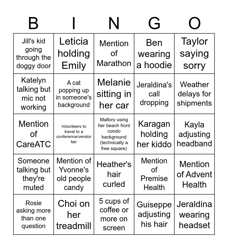 This bingo card has a free space and 24 words: Mention of Yvonne's old people candy, Choi on her treadmill, Melanie sitting in her car, Rosie asking more than one question, Taylor saying sorry, Jill's kid going through the doggy door, Katelyn talking but mic not working, Leticia holding Emily, Karagan holding her kiddo, Heather's hair curled, Jeraldina's call dropping, Mention of CareATC, Mention of Premise Health, Mention of Advent Health, A cat popping up in someone's background, Guiseppe adjusting his hair, Kayla adjusting headband, Mention of Marathon, Weather delays for shipments, Volunteers to travel to a conference/vendor fair, Jeraldina wearing headset, Someone talking but they're muted, Ben wearing a hoodie and 5 cups of coffee or more on screen.