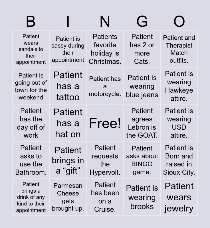 This bingo card has a free space and 24 words: Patient brings in a “gift”, Parmesan Cheese gets brought up., Patient has a motorcycle., Patient brings a drink of any kind to their appointment, Patient and Therapist Match outfits., Patient wears sandals to their appointment, Patient is going out of town for the weekend, Patient is sassy during their appointment, Patient agrees Lebron is the GOAT., Patient requests the Hypervolt., Patient is wearing blue jeans, Patient has the day off of work, Patient asks about BINGO game., Patient is Born and raised in Sioux City., Patient has a tattoo, Patient is wearing brooks, Patient is wearing USD attire., Patients favorite holiday is Christmas., Patient is wearing Hawkeye attire., Patient has a hat on, Patient wears jewelry, Patient asks to use the Bathroom., Patient has 2 or more Cats. and Patient has been on a Cruise..