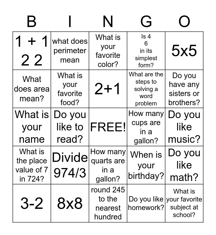 This bingo card has a free space and 24 words: Divide 974/3, 8x8, 2+1, 3-2, 5x5, 1 + 1 2 2, What does area mean?, what does perimeter mean, How many cups are in a gallon?, How many quarts are in a gallon?, What are the steps to solving a word problem, What is your name, When is your birthday?, Do you like math?, What is your favorite food?, Do you like homework?, Do you like music?, What is your favorite color?, Do you have any sisters or brothers?, Do you like to read?, What is your favorite subject at school?, What is the place value of 7 in 724?, Is 4 6 in its simplest form? and round 245 to the nearest hundred.