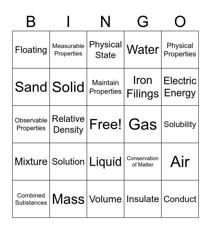 This bingo card has a free space and 30 words: Mass, Magnetism, Relative Density, Sinking, Floating, Physical State, Solid, Liquid, Gas, Volume, Solubility, Conduct, Insulate, Thermal Energy, Electric Energy, Particles, Conservation of Matter, Mixture, Solution, Physical Properties, Observable Properties, Testable Properties, Measurable Properties, Iron Filings, Sand, Water, Air, Combined Substances, Maintain Properties and Dissolve.