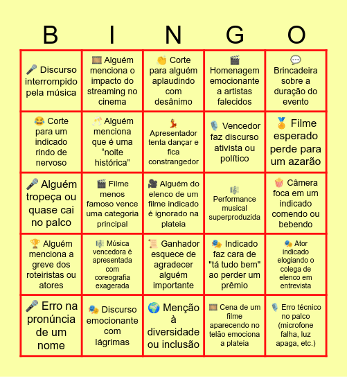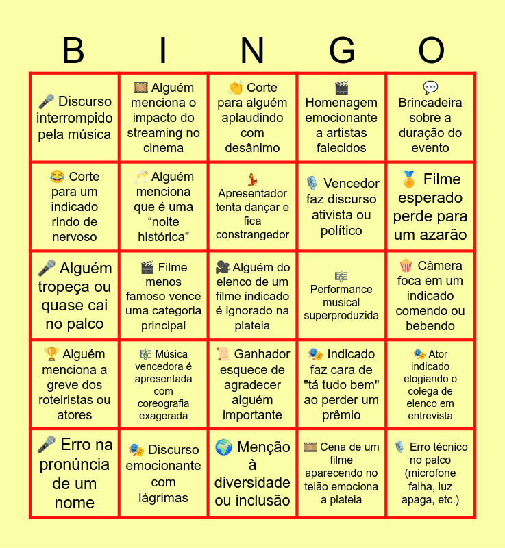 This bingo card has 30 words: 🎭 Discurso emocionante com lágrimas, 🎙️ Piada que ninguém ri, 🎬 Filme menos famoso vence uma categoria principal, 🏆 Vencedor menciona que não esperava ganhar, 🎤 Discurso interrompido pela música, 👏 Corte para alguém aplaudindo com desânimo, 🥂 Alguém menciona que é uma “noite histórica”, 📜 Ganhador esquece de agradecer alguém importante, 🎼 Performance musical superproduzida, 🌍 Menção à diversidade ou inclusão, 🍿 Câmera foca em um indicado comendo ou bebendo, 🎥 Alguém do elenco de um filme indicado é ignorado na plateia, 🎞️ Cena de um filme aparecendo no telão emociona a plateia, 🎙️ Erro técnico no palco (microfone falha, luz apaga, etc.), 🏅 Filme esperado perde para um azarão, 📸 Alguém tirando uma selfie no meio do evento, 🎭 Indicado faz cara de "tá tudo bem" ao perder um prêmio, 🏆 Alguém menciona a greve dos roteiristas ou atores, 🎼 Música vencedora é apresentada com coreografia exagerada, 💬 Brincadeira sobre a duração do evento, 🎤 Alguém tropeça ou quase cai no palco, 🍾 Brinde com champanhe na plateia, 🎞️ Alguém menciona o impacto do streaming no cinema, 🎙️ Vencedor faz discurso ativista ou político, 😂 Corte para um indicado rindo de nervoso, 🎬 Homenagem emocionante a artistas falecidos, 🎭 Ator indicado elogiando o colega de elenco em entrevista, 🎤 Erro na pronúncia de um nome, 💃 Apresentador tenta dançar e fica constrangedor and 🏆 Vencedor traz papelzinho para ler o discurso.