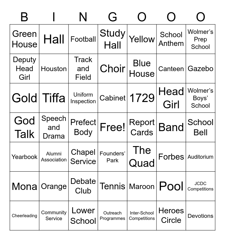 This bingo card has a free space and 100 words: 295, Maroon, Gold, John, Passion and Purity, Cowper, Netball, Volleyball, Holy Lawn, Sports Day, Upper School, Staffroom, Lower School, God Talk, Barrows, Forbes, Houston, Hollar, Murray, Spirit Week, Office, Honours Class, Pool, Science Lab, Orange, Gazebo, Yellow, 1729, Age Quod Agis, Red House, Blue House, Green House, Yellow House, Cheerleading, Prefect Body, Deputy Head Girl, Head Girl, Graduation Ceremony, Chapel Service, Devotions, Inter-School Competitions, Debate Club, Choir, Band, Track and Field, Football, Cricket, Tennis, Chess Club, Speech and Drama, School Magazine, Yearbook, Alumni Association, Founder's Day, Prize-Giving Ceremony, Teachers’ Lounge, Sixth Form Block, Homework Centre, School Library, Study Hall, Computer Lab, Science Fair, Art Room, Home Economics Lab, Guidance Counsellor, Principal’s Office, PTA (Parent-Teacher Association), School Bell, Mid-Term Exams, End-of-Year Exams, Report Cards, Uniform Inspection, Detention, Peer Counsellors, Outreach Programmes, Community Service, Graduation Rings, School Anthem, JCDC Competitions, Founders’ Park, Historic Archway, Canteen, Dance Troupe, Cabinet, Auditorium, Hall, Lunch Line, Wayne Marshall, Shelly-Ann, Tiffa, The Quad, Wolmer’s Trust, Wolmer’s Girls’ School, Wolmer’s Boys’ School, Wolmer’s Prep School, Wolmer’s Pre-School, Heroes Circle, Mona, School Crest and House System.