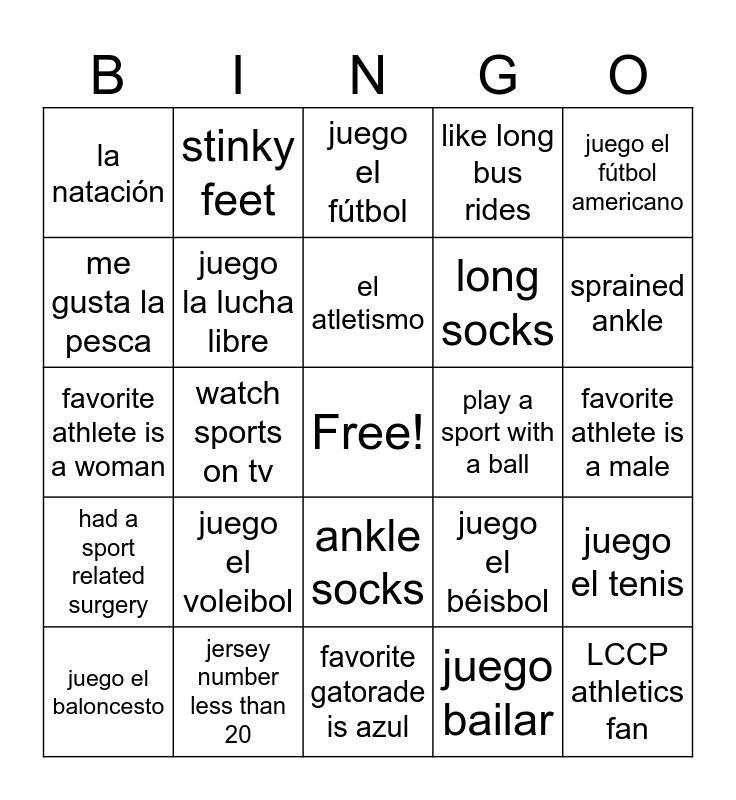 This bingo card has a free space and 24 words: juego el baloncesto, juego el voleibol, el atletismo, juego bailar, juego el fútbol americano, la natación, stinky feet, juego el fútbol, play a sport with a ball, favorite athlete is a male, favorite athlete is a woman, juego la lucha libre, juego el béisbol, juego el tenis, me gusta la pesca, jersey number less than 20, favorite gatorade is azul, like long bus rides, sprained ankle, had a sport related surgery, watch sports on tv, ankle socks, long socks and LCCP athletics fan.