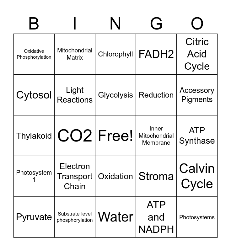 This bingo card has a free space and 24 words: Electron Transport Chain, Substrate-level phosphorylation, Glycolysis, Pyruvate, Citric Acid Cycle, Oxidative Phosphorylation, Cytosol, Mitochondrial Matrix, Inner Mitochondrial Membrane, Oxidation, Reduction, Thylakoid, Stroma, Calvin Cycle, Light Reactions, ATP and NADPH, ATP Synthase, Chlorophyll, Accessory Pigments, CO2, Photosystems, Photosystem 1, FADH2 and Water.