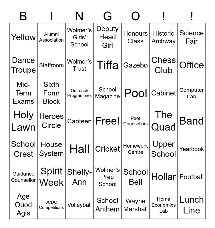 This bingo card has a free space and 100 words: Track and Field, School Bell, Mid-Term Exams, End-of-Year Exams, Report Cards, 295, Maroon, Gold, John, Passion and Purity, Cowper, Netball, Volleyball, Holy Lawn, Sports Day, Upper School, Staffroom, Lower School, God Talk, Barrows, Forbes, Houston, Hollar, Murray, Spirit Week, Office, Honours Class, Pool, Science Lab, Orange, Gazebo, Yellow, 1729, Age Quod Agis, Canteen, Dance Troupe, Cabinet, Auditorium, Hall, Lunch Line, Wayne Marshall, Shelly-Ann, Tiffa, The Quad, Wolmer’s Trust, Wolmer’s Girls’ School, Wolmer’s Boys’ School, Wolmer’s Prep School, Wolmer’s Pre-School, Heroes Circle, Mona, School Crest, House System, Red House, Blue House, Green House, Yellow House, Cheerleading, Prefect Body, Deputy Head Girl, Head Girl, Graduation Ceremony, Chapel Service, Devotions, Inter-School Competitions, Debate Club, Choir, Band, Uniform Inspection, Detention, Peer Counsellors, Outreach Programmes, Community Service, Graduation Rings, School Anthem, JCDC Competitions, Founders’ Park, Historic Archway, Football, Cricket, Tennis, Chess Club, Speech and Drama, School Magazine, Yearbook, Alumni Association, Founder's Day, Prize-Giving Ceremony, Teachers’ Lounge, Sixth Form Block, Homework Centre, School Library, Study Hall, Computer Lab, Science Fair, Art Room, Home Economics Lab, Guidance Counsellor, Principal’s Office and PTA (Parent-Teacher Association).