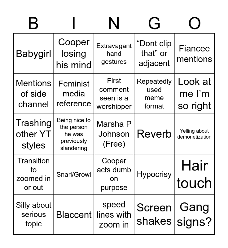 This bingo card has a free space and 61 words: Sped up rambling, Blaccent, Mentions film stuff, Transition to zoomed in or out, Screen shakes, Making fun of men, Feminist media reference, Painted nails/jewelry, Repeatedly used meme format, Talking without opening mouth, “Dont clip that” or adjacent, Music for the girls/gays, Mentions of side channel, Talk about tiktok days, Standing up into background, Babygirl, Gang signs?, Fiancee mentions, Unnecessarily mean, First comment seen is a worshipper, Reverb, Extravagant hand gestures, Silly about serious topic, Hair touch, “I’m the bad boy of YouTube”, Weirdos, Wrist Thing, Sound effect over video overlay, Look at me I’m so right, Plug of some sort (His Brand), Homeschool mention, I’m not like the other white guys, Harry Styles, “Ladies”, Cooper losing his mind, Impression of something/someone, Lowkey misogyny, Being nice to the person he was previously slandering, Cooper being “relatable”, Trashing other YT styles, References to media, Snarl/Growl, Yelling about demonetization, Yelling about something ridiculous, Hypocrisy, Dog mention, Proving himself too hard, Mentions Lesbians, Lowkey thirst trap, Cooper acts dumb on purpose, speed lines with zoom in, weird cut, Volume inappropriate for the situation, Hung up on the wrong thing, Physically gives us the ick at the same time, Backtracking, screen shake, voice changer, stutter, god awful and mic peaking.