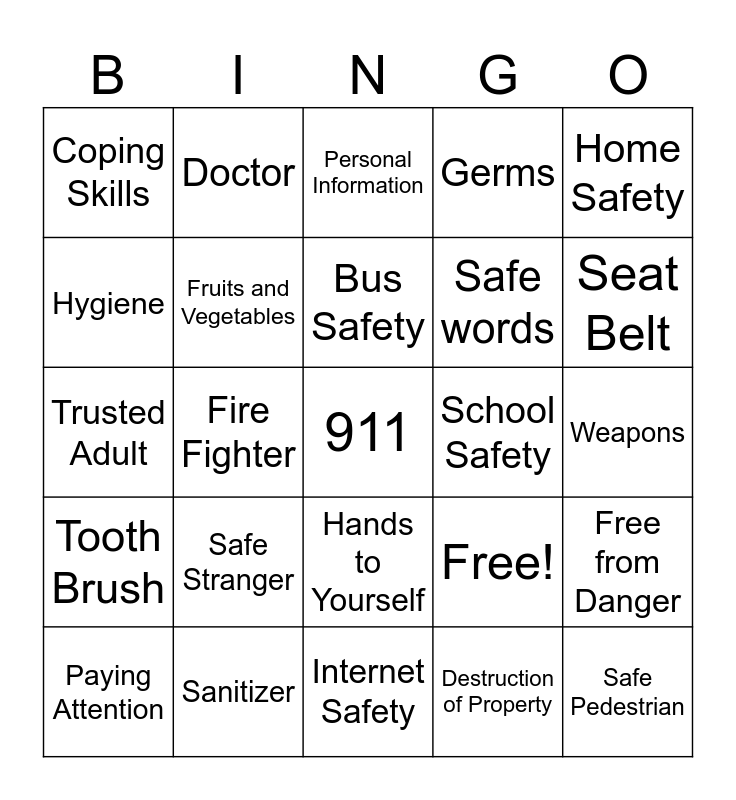 This bingo card has 25 words: Safe Stranger, Internet Safety, Bus Safety, Paying Attention, Home Safety, Coping Skills, Hygiene, Doctor, School Safety, Hands to Yourself, Safe words, Trusted Adult, Free!, Free from Danger, Fruits and Vegetables, Safe Pedestrian, Weapons, Personal Information, Seat Belt, Fire Fighter, 911, Sanitizer, Tooth Brush, Germs and Destruction of Property.