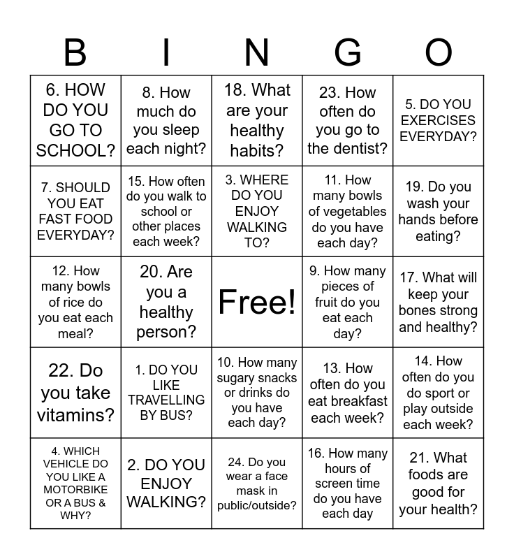 This bingo card has a free space and 24 words: 1. DO YOU LIKE TRAVELLING BY BUS?, 2. DO YOU ENJOY WALKING?, 3. WHERE DO YOU ENJOY WALKING TO?, 4. WHICH VEHICLE DO YOU LIKE A MOTORBIKE OR A BUS & WHY?, 5. DO YOU EXERCISES EVERYDAY?, 6. HOW DO YOU GO TO SCHOOL?, 7. SHOULD YOU EAT FAST FOOD EVERYDAY?, 8. How much do you sleep each night?, 9. How many pieces of fruit do you eat each day?, 10. How many sugary snacks or drinks do you have each day?, 11. How many bowls of vegetables do you have each day?, 12. How many bowls of rice do you eat each meal?, 13. How often do you eat breakfast each week?, 14. How often do you do sport or play outside each week?, 15. How often do you walk to school or other places each week?, 16. How many hours of screen time do you have each day, 17. What will keep your bones strong and healthy?, 18. What are your healthy habits?, 19. Do you wash your hands before eating?, 20. Are you a healthy person?, 21. What foods are good for your health?, 22. Do you take vitamins?, 23. How often do you go to the dentist? and 24. Do you wear a face mask in public/outside?.