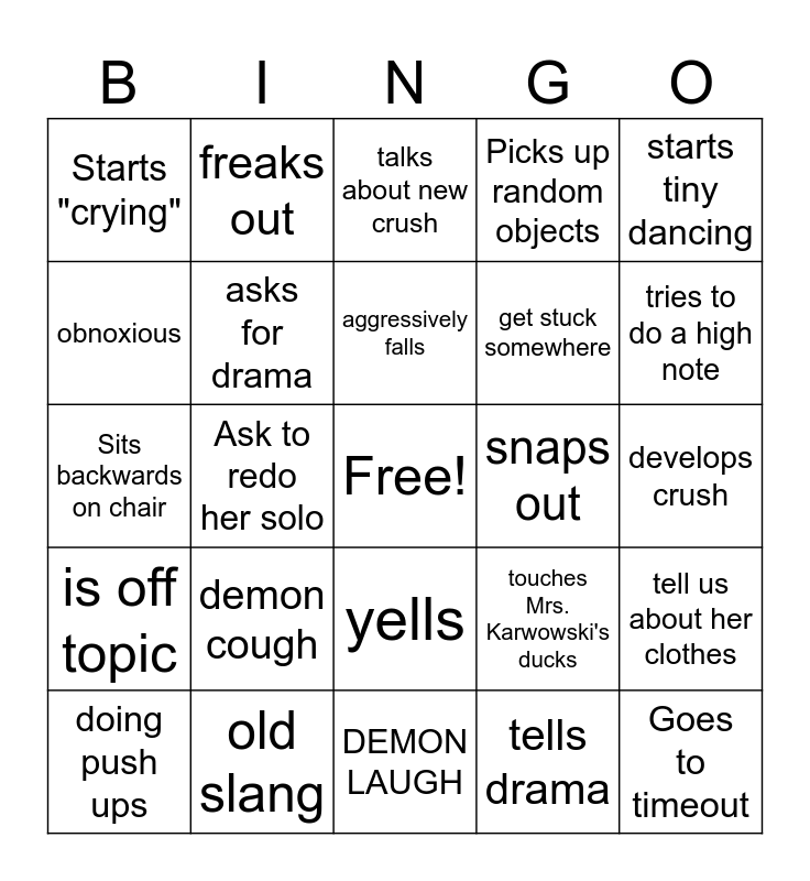 This bingo card has a free space and 24 words: demon cough, old slang, aggressively falls, doing push ups, starts tiny dancing, Starts "crying", obnoxious, freaks out, snaps out, yells, get stuck somewhere, Sits backwards on chair, touches Mrs. Karwowski's ducks, tell us about her clothes, asks for drama, tells drama, develops crush, talks about new crush, tries to do a high note, Ask to redo her solo, Goes to timeout, is off topic, Picks up random objects and DEMON LAUGH.