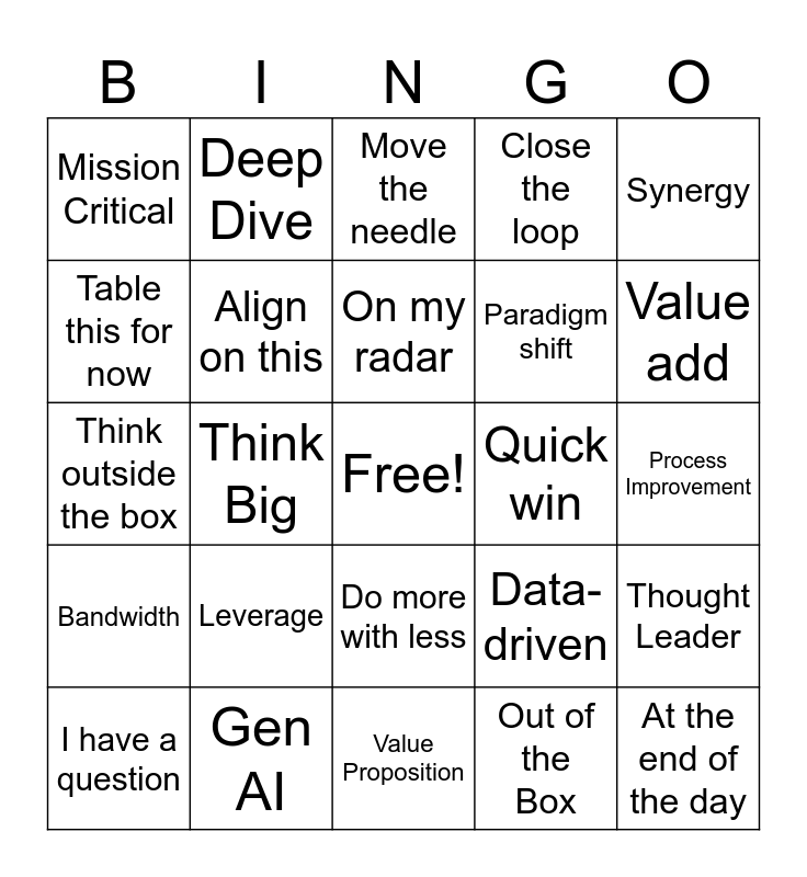 This bingo card has a free space and 34 words: Circle Back, Out of the Box, Take this offline, Game Changer, Bandwidth, Align on this, Synergy, I have a question, Deep Dive, Win-Win, On my radar, Move the needle, Low-hanging Fruit, Best practices, Quick win, Value add, Gen AI, Think outside the box, Leverage, Data-driven, Do more with less, Dial it in, Mission Critical, Process Improvement, Value Proposition, At the end of the day, Close the loop, Double down, Paradigm shift, Table this for now, That's a great question (used when buying time), Think Big, Thought Leader and SME.