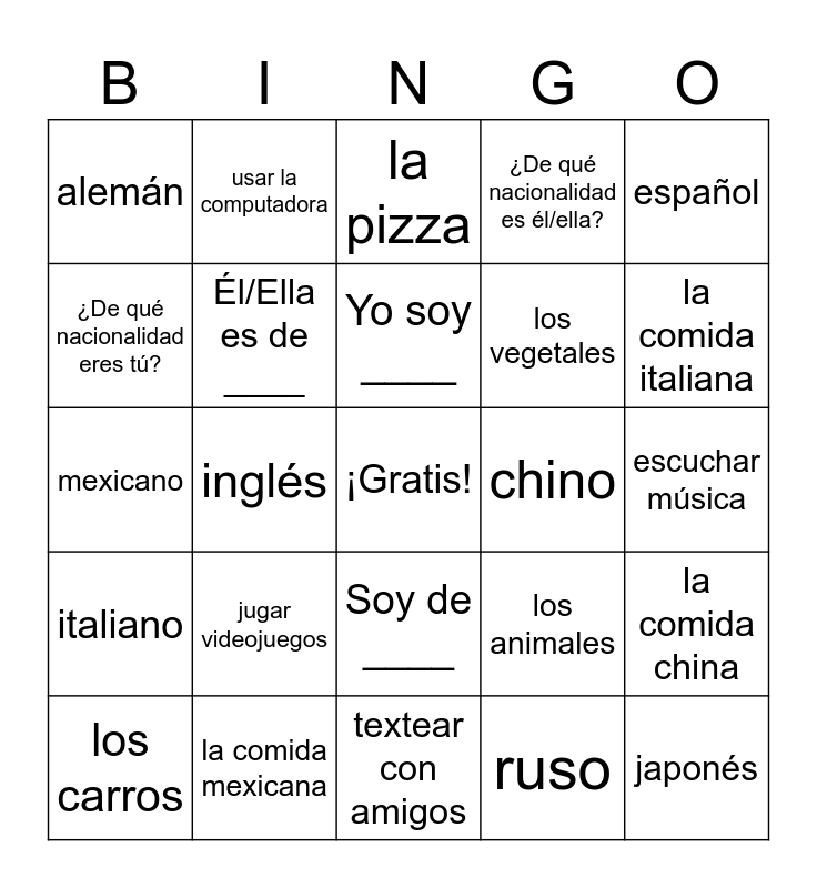 This bingo card has a free space and 35 words: la nacionalidad, ¿De dónde es él/ella?, ¿De dónde eres tú?, Él/Ella es de ____, Soy de ____, ¿De qué nacionalidad es él/ella?, ¿De qué nacionalidad eres tú?, Él/Ella es ______, Yo soy ____, estadounidense, mexicano, español, francés, canadiense, alemán, chino, ruso, inglés, italiano, japonés, los animales, los carros, la comida china, la comida mexicana, la pizza, la comida italiana, las hamburguesas, las frutas, los vegetales, escuchar música, hablar por teléfono, textear con amigos, jugar videojuegos, usar la computadora and ver la televisión.