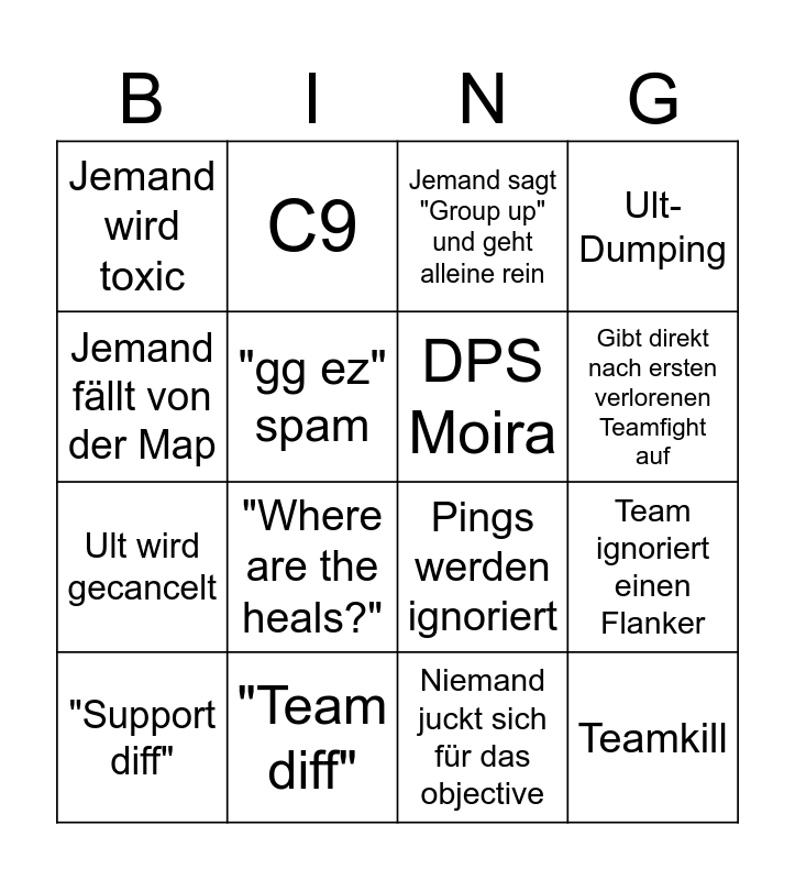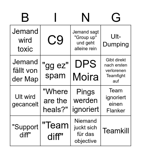This bingo card has 16 words: "Team diff", Team ignoriert einen Flanker, Jemand sagt "Group up" und geht alleine rein, Jemand wird toxic, Ult wird gecancelt, C9, Pings werden ignoriert, Niemand juckt sich für das objective, Jemand fällt von der Map, "gg ez" spam, "Support diff", Ult-Dumping, "Where are the heals?", Gibt direkt nach ersten verlorenen Teamfight auf, DPS Moira and Teamkill.