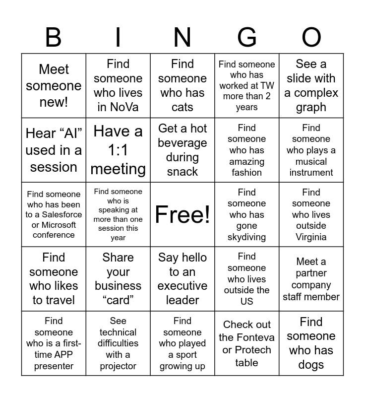 This bingo card has a free space and 26 words: Say hello to an executive leader, Check out the Fonteva or Protech table, Get a hot beverage during snack, See technical difficulties with a projector, See a slide with a complex graph, Meet someone new!, Hear “AI” used in a session, Find someone who lives in NoVa, Find someone who lives outside Virginia, Find someone who lives outside the US, Find someone who has amazing fashion, Find someone who has been to a Salesforce or Microsoft conference, Meet a partner company staff member, Find someone who is a first-time APP presenter, Find someone who is speaking at more than one session this year, Find someone who has worked at TW less than a year, Find someone who has worked at TW more than 2 years, Find someone who likes to travel, Find someone who has cats, Find someone who has dogs, Find someone who plays a musical instrument, Find someone who played a sport growing up, Find someone who has gone skydiving, Share your business “card”, Have a 1:1 meeting and See a demo during a session.