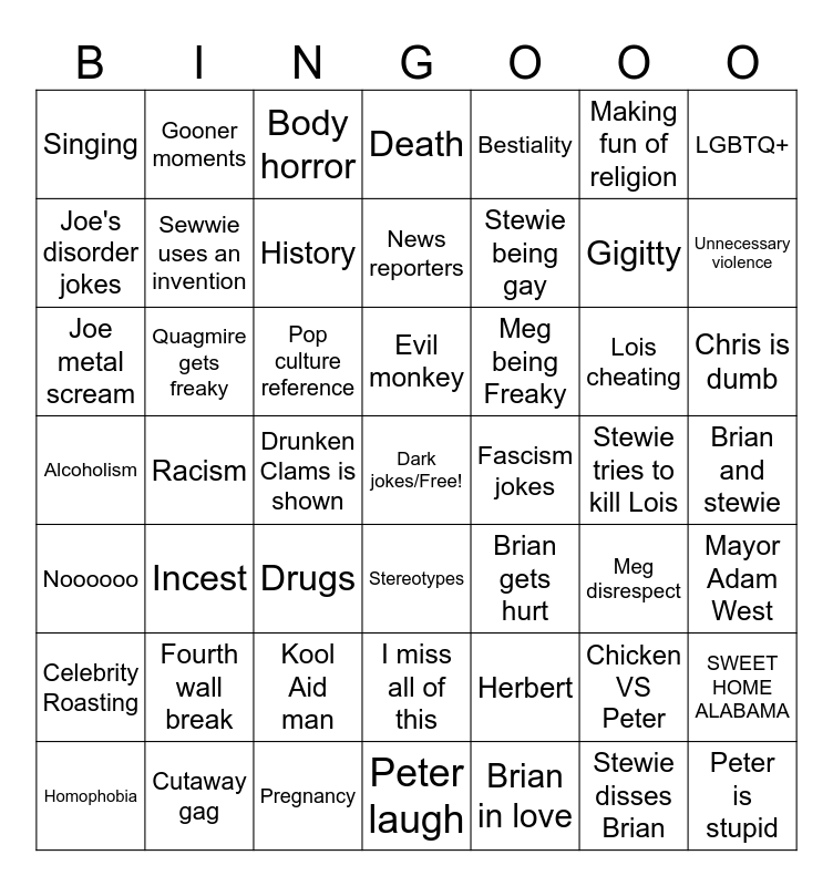 This bingo card has a free space and 48 words: Herbert, Gigitty, Peter laugh, Racism, Pop culture reference, Brian and stewie, Gooner moments, Cutaway gag, Making fun of religion, Stereotypes, LGBTQ+, Death, Lois cheating, Meg being Freaky, Celebrity Roasting, Stewie tries to kill Lois, Joe's disorder jokes, Unnecessary violence, Chicken VS Peter, Bestiality, Stewie being gay, Drunken Clams is shown, Singing, Sewwie uses an invention, SWEET HOME ALABAMA, History, Chris is dumb, Homophobia, Evil monkey, Quagmire gets freaky, Stewie disses Brian, Fascism jokes, Mayor Adam West, Fourth wall break, Alcoholism, Brian gets hurt, Meg disrespect, Joe metal scream, Drugs, Kool Aid man, Noooooo, Peter is stupid, Body horror, Pregnancy, News reporters, I miss all of this, Incest and Brian in love.