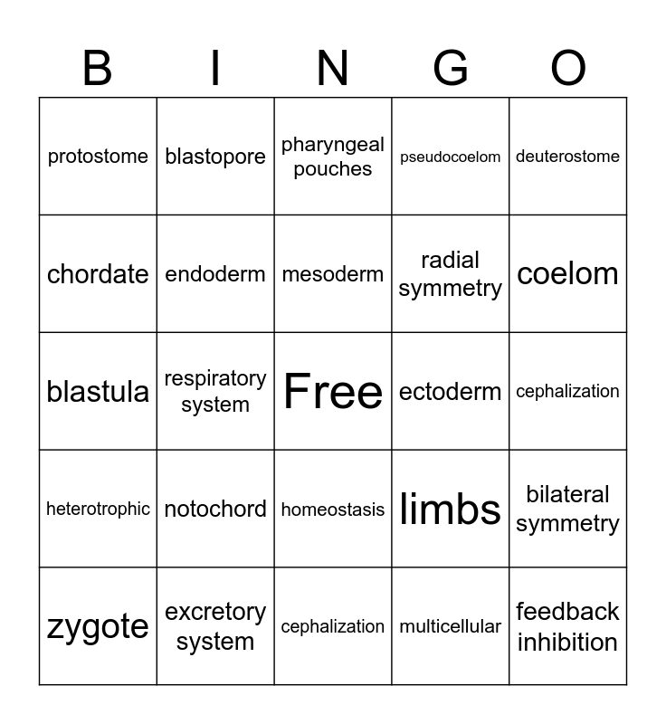 This bingo card has a free space and 24 words: notochord, excretory system, mesoderm, zygote, deuterostome, protostome, chordate, blastopore, ectoderm, homeostasis, radial symmetry, blastula, limbs, bilateral symmetry, endoderm, multicellular, cephalization, pharyngeal pouches, coelom, respiratory system, feedback inhibition, heterotrophic, pseudocoelom and cephalization.