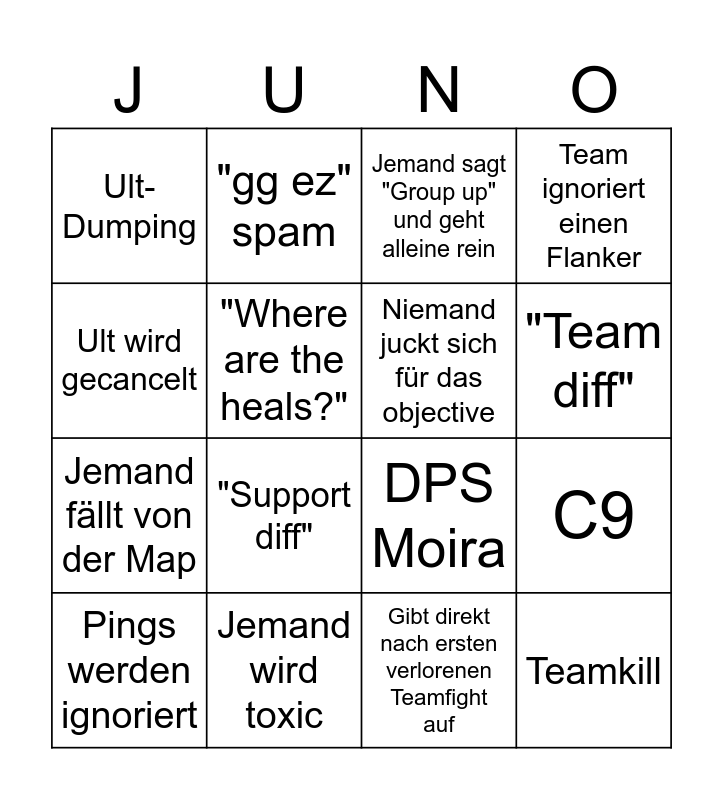This bingo card has 16 words: Jemand wird toxic, C9, Jemand sagt "Group up" und geht alleine rein, Ult-Dumping, Jemand fällt von der Map, "gg ez" spam, DPS Moira, Gibt direkt nach ersten verlorenen Teamfight auf, Ult wird gecancelt, "Where are the heals?", Pings werden ignoriert, Team ignoriert einen Flanker, "Support diff", "Team diff", Niemand juckt sich für das objective and Teamkill.