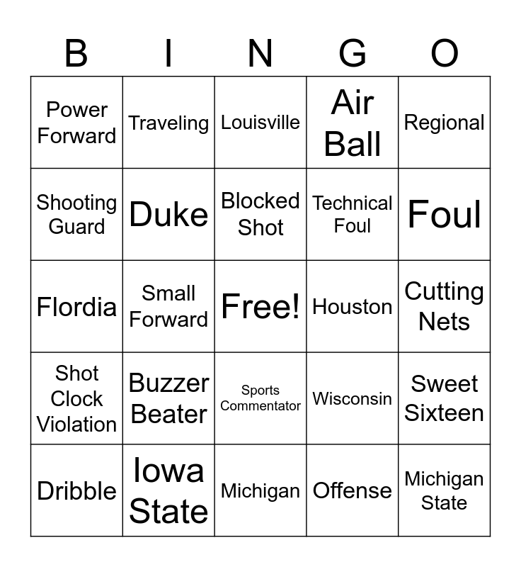 This bingo card has a free space and 64 words: NCAA, Final Four, Elite Eight, Sweet Sixteen, Bracket, Blocking, Traveling, The Big Dance, Blocked Shot, Rebound, Sports Commentator, Cinderella, Cutting Nets, Regional, Point Guard, Shooting Guard, Small Forward, Power Forward, Center, Technical Foul, Buzzer Beater, Shot Clock Violation, Air Ball, Turnover, Free Throw, Double Dribble, Slam Dunk, Defense, 3-Pointer, Pass, Layup, Score Board, Hoop, Basketball Shoes, Foul, Dribble, Swish, Offense, Auburn, Duke, Flordia, Houston, Tennessee, Alabama, St. John's, Michigan State, Iowa State, Texas Tech, Wisconsin, Texas A&M, Clemson, Missouri, Michigan, Maryland, Kentucky, Memphis, Louisville, Purdue, Marquette, Arizona, St. Mary's CA, Mississippi State, BYU and Trophy.