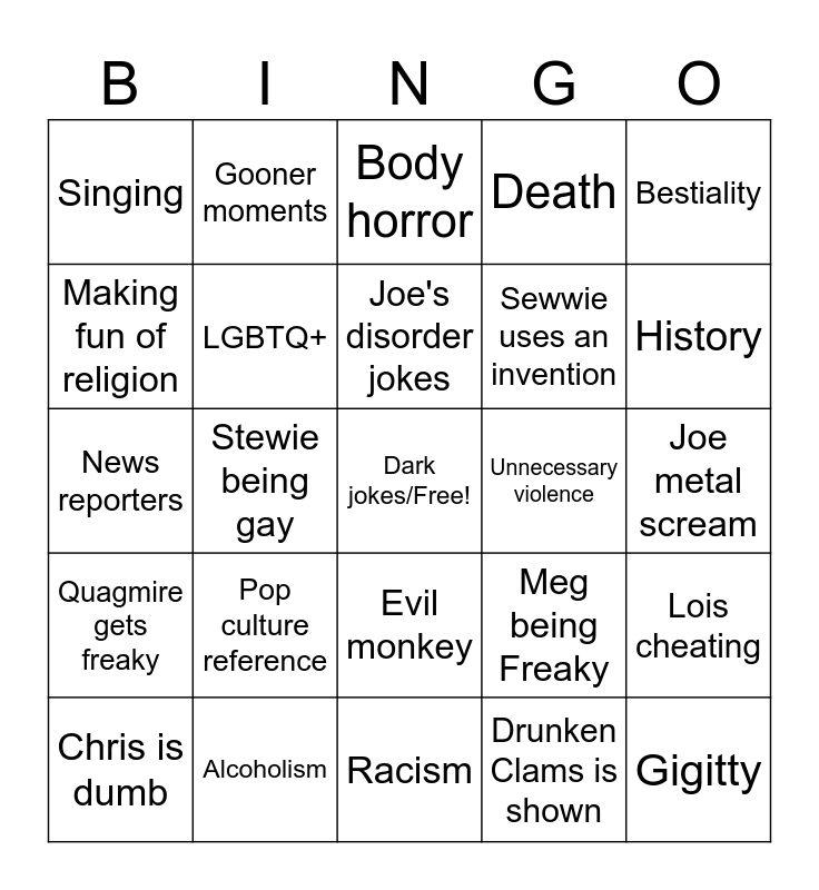 This bingo card has a free space and 48 words: Herbert, Gigitty, Peter laugh, Racism, Pop culture reference, Brian and stewie, Gooner moments, Cutaway gag, Making fun of religion, Stereotypes, LGBTQ+, Death, Lois cheating, Meg being Freaky, Celebrity Roasting, Stewie tries to kill Lois, Joe's disorder jokes, Unnecessary violence, Chicken VS Peter, Bestiality, Stewie being gay, Drunken Clams is shown, Singing, Sewwie uses an invention, SWEET HOME ALABAMA, History, Chris is dumb, Homophobia, Evil monkey, Quagmire gets freaky, Stewie disses Brian, Fascism jokes, Mayor Adam West, Fourth wall break, Alcoholism, Brian gets hurt, Meg disrespect, Joe metal scream, Drugs, Kool Aid man, Noooooo, Peter is stupid, Body horror, Pregnancy, News reporters, I miss all of this, Incest and Brian in love.
