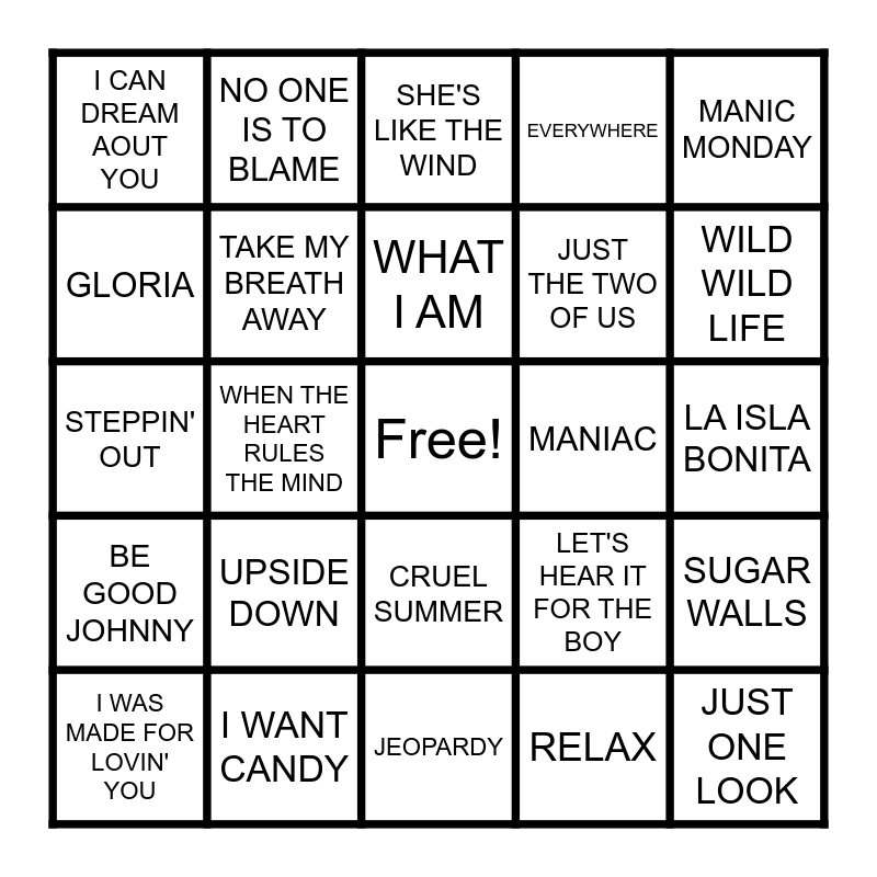 This bingo card has a free space and 54 words: BAND OF GOLD, BE GOOD JOHNNY, BRASS IN POCKET, CHARIOTS OF FIRE, CRUEL SUMMER, DO YOU REALLY WANT TO HURT ME, EVERYWHERE, FIGHT FOR YOUR RIGHT, GLORIA, HOW WILL I KNOW, I CAN DREAM AOUT YOU, I SAW HOM STANDING THERE, I WANT CANDY, I WAS MADE FOR LOVIN' YOU, IS SHE REALLY GOING OUT WITH HIM?, JEOPARDY, JUST ONE LOOK, JUST THE TWO OF US, KIDS IN AMERICA, LA ISLA BONITA, LET'S HEAR IT FOR THE BOY, LOVE IS AN ELEVATOR, MANIAC, MANIC MONDAY, NESTY, NO ONE IS TO BLAME, ONLY IN MY DREAMS, ONLY TIME WILL TELL, RAPPER'S DELIGHT, RELAX, ROCK THIS TOWN, SEPARATE WAYS (WORLDS APART), SEXUAL HEALING, SHAKE YOU DOWN, SHE'S LIKE THE WIND, START ME UP, STEPPIN' OUT, SUGAR WALLS, SUNGLASSES AT NIGHT, TAKE MY BREATH AWAY, THE LOOK OF LOVE, THE WAY YOU MAKE ME FEEL, TOO SHY, UNDER PRESSURE, UPSIDE DOWN, VACATION, VERONICA, WALK OF LIFE, WHAT I AM, WHEN THE HEART RULES THE MIND, WILD WILD LIFE, WILD WILD WEST, WISHING WELL and YOU'RE A FRIEND OF MINE.