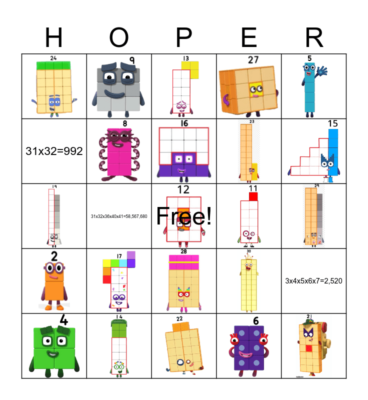 This bingo card has 29 images, a free space and 5 words: 31x32=992, 36x40x41=59,040, 31x32x36x40x41=58,567,680, 3x4x5x6x7=2,520 and Like it.