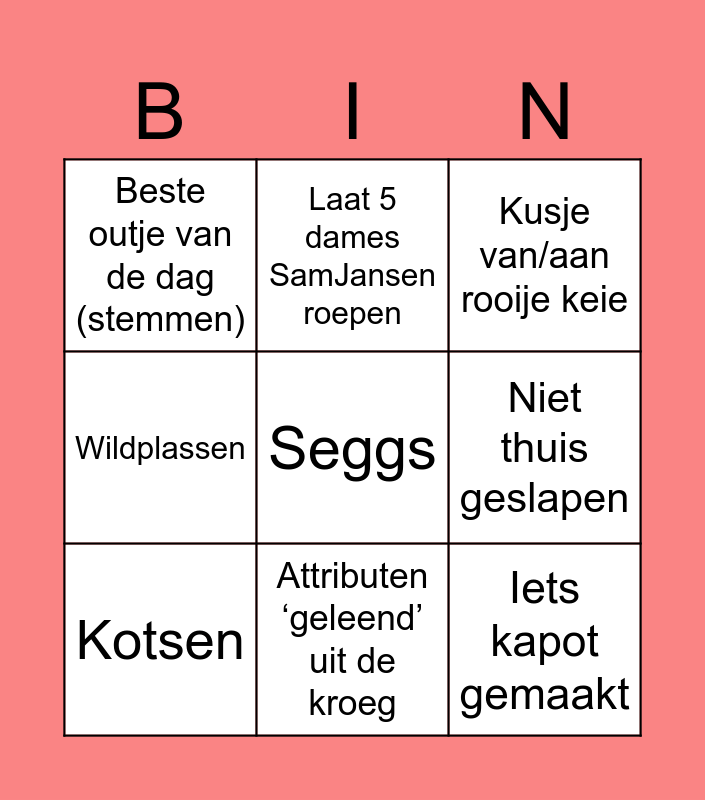 This bingo card has 9 words: Kotsen, Kusje van/aan rooije keie, Laat 5 dames SamJansen roepen, Wildplassen, Beste outje van de dag (stemmen), Niet thuis geslapen, Seggs, Iets kapot gemaakt and Attributen ‘geleend’ uit de kroeg.
