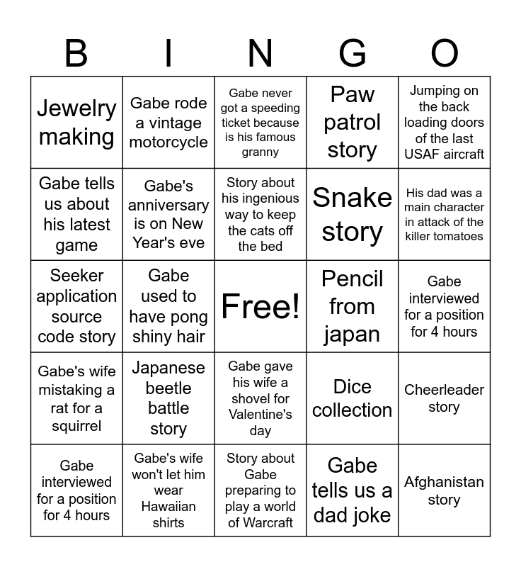 This bingo card has a free space and 24 words: Japanese beetle battle story, Gabe's wife won't let him wear Hawaiian shirts, Story about his ingenious way to keep the cats off the bed, Gabe interviewed for a position for 4 hours, Jumping on the back loading doors of the last USAF aircraft, Jewelry making, Gabe tells us about his latest game, Gabe rode a vintage motorcycle, Pencil from japan, Gabe gave his wife a shovel for Valentine's day, Snake story, Seeker application source code story, Dice collection, Cheerleader story, Gabe's anniversary is on New Year's eve, Gabe tells us a dad joke, Gabe interviewed for a position for 4 hours, Gabe never got a speeding ticket because is his famous granny, His dad was a main character in attack of the killer tomatoes, Gabe used to have pong shiny hair, Afghanistan story, Gabe's wife mistaking a rat for a squirrel, Paw patrol story and Story about Gabe preparing to play a world of Warcraft.