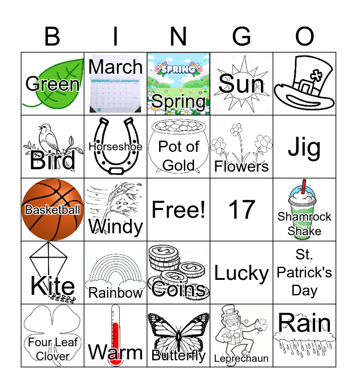 This bingo card has 20 images, a free space and 23 words: Four Leaf Clover, Rainbow, Pot of Gold, Leprechaun, Green, March, Spring, 17, Shamrock Shake, Basketball, Horseshoe, Lucky, St. Patrick's Day, Bird, Warm, Butterfly, Sun, Jig, Kite, Windy, Coins, Flowers and Rain.